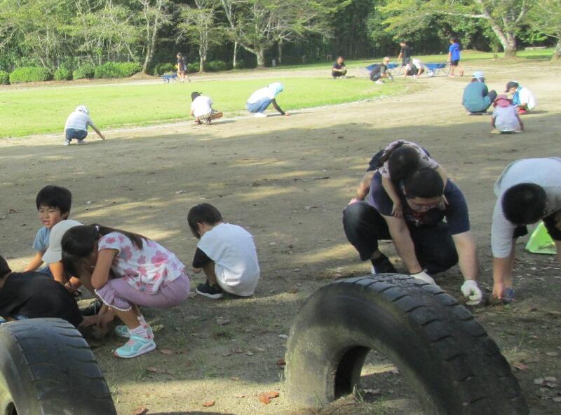 次に親子美化作業では、運動場を中心に草取りや溝の掃除、石ひろいを、親子、兄弟姉妹、友だち同士で熱心に行いました。おかげできれいな運動場になり、2学期からの運動会の練習や、須恵小・須恵地区合同運動会に向けての準備が整いました。ありがとうございました。
