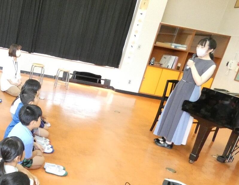 9月29日(金)5時間目に月足さおりさんに来ていただいて、スクールコンサートを開催しました。月足さんは、作品との出会いや曲に込められた思いをお話しくださり、ご自身が作曲された「しずく」を含め5曲を披露していただきました。