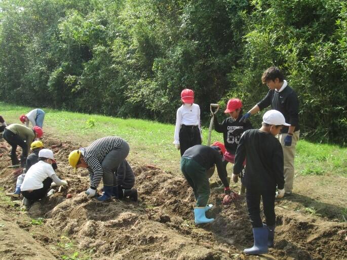 10月16日(月)、1年生、2年生、3年生は、生活科・総合的な学習の時間で『いもほり』をしました。天候にも恵まれ絶好の収穫日和でした。