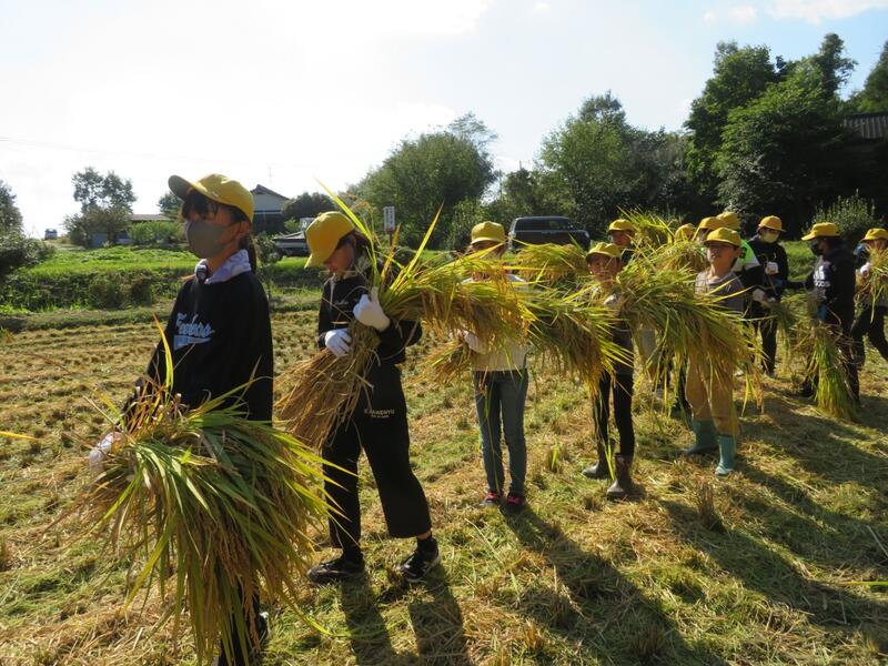 10月16日(月)に稲刈りを行いました。6月に植えた苗が立派な稲になっていました。子どもたちは、鎌を使って手作業で稲を刈りました。はじめは慣れない鎌を、恐る恐る握っていた子どもたちでしたが、稲を刈る感触が気持ちよく、次第に楽しそうに刈っていました。稲刈り後は、こぼれ落ちた苗を拾いながら、1粒を収穫する大変さを感じていました。