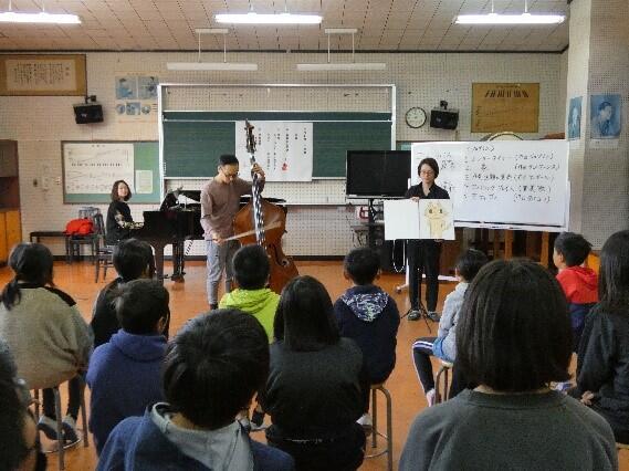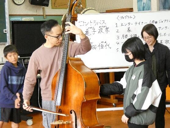 11月28日(火)に、演奏家派遣アウトリーチ事業がありました。今年度は、コントラバス奏者の亀子政孝さんとピアノ伴奏の園田佳代さんにお越しいただき、すてきな演奏を聴かせていただきました。コントラバスを初めて見る子供たちばかりで、とても興味津々でした。今回は、5曲演奏していただき、様々なコントラバスの音色を聴くことができました。また、コントラバスの振動も体験できました。今回の演奏会で、音楽を好きになったり、楽器に興味がでたりする子供たちもいたようです。