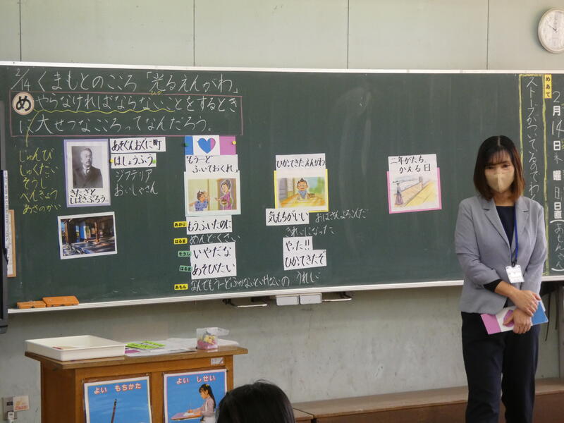 10月3日から31日まで、岩﨑日菜実先生が教育実習に来られていました。実習中は、朝から靴箱で全校児童を迎え、休み時間や掃除の時間も一緒に過ごされました。6年生では、国語『秋深し』、道徳『手品師』等の授業をされ、子供たちにしっかり考える場面を作られていました。また、2年生や4年生に読み聞かせもされました。4週間で、全校児童が岩﨑日菜実先生のことが大好きになりました。