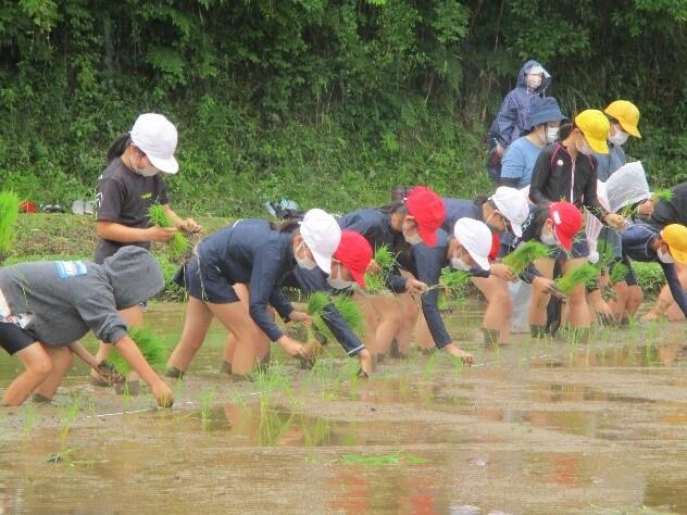 6月13日(月)に稲作体験の一環で田植えを行いました。JA青壮年部の方々のご協力のもと、4・5・6年生が取り組みました。普段は入ることのない田んぼの感触を楽しみながらも、真剣な表情で植えている姿が見られました。頑張って植えた苗がしっかりと根付き、秋にはたわわに実ることを楽しみにしています。それまでしっかりと生育を観察していきたいと思います。