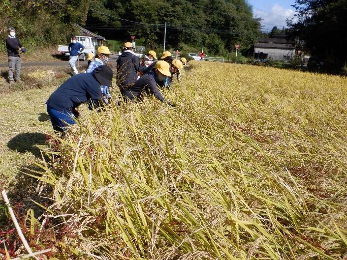 6月に植えた苗がすくすくと生長し、立派な稲になりました。稲刈り鎌を使って手作業で刈りました。始めてすぐは慣れない鎌に恐る恐るの様子だった子供たちでしたが、稲を刈る感触が気持ちよく、次第に楽しそうに刈っていました。