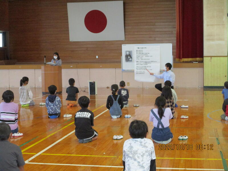 10月の全校集会は、5・6年担任が話をしました。宮沢賢治さんの『雨にも負けず』