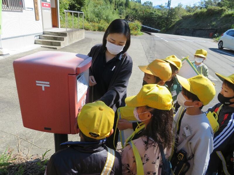 郵便局では、切手の役割や手紙の届け方について教えていただきました。ポストの中も見せていただき、大興奮で質問をしました。「ポストの中が見えない」、「手を入れて取り出せない」など手紙を守る工夫がたくさんあることを学びました。