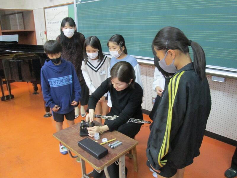 アウトリーチ事業は、プロの演奏家に音楽の授業をしてもらうことを通して音楽の楽しさに触れることを目的として、毎年行われている事業です。今年度は、オーボエ奏者の若木麻有さんに来ていただきました。オーボエの魅力を心が込もった演奏とすてきなお話で伝えられました。子供たちは、オーボエの美しい音色に終始聞き入っていました。演奏の他にも、楽器のリードの作り方を間近で見せていただきました。
