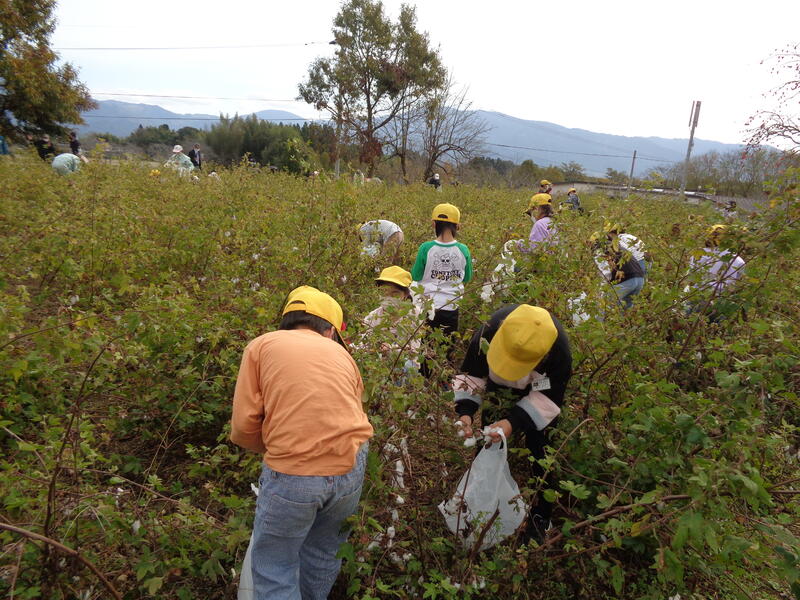 11月24日(木)に、毎年恒例の和綿の収穫会を行いました。つつじヶ丘学園の方々をはじめ、たくさんの人たちと一緒に収穫を体験しました。1・2年生の子供たちは、南稜高校や人吉高校の生徒さんにお世話になりながら、和綿を一つ一つ丁寧につんでいきました。収穫した和綿の重さは、19.5kgでした。今年もたくさんの人たちのおかげで笑顔あふれる体験活動ができました。ありがとうございました。