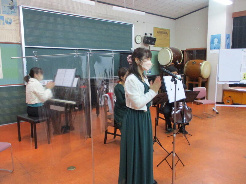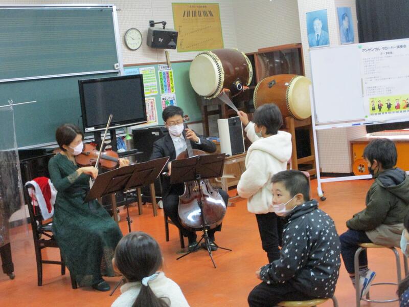 今年度の芸術鑑賞には、アンサンブルクローバーさんに来ていただき、音楽鑑賞会を行いました。新型コロナウィルス感染拡大防止のために、低学年(1~3年生)と高学年(4~6年生)に分かれて演奏を聴きました。「北風と太陽」の読み聞かせやクリスマスメドレーなど、様々な曲を演奏していただきました。また、指揮者体験のコーナーもあり、各学年から1名ずつ体験をしました。子供たちは、生の演奏を聴いて、「伝える力」や「感じる力」を高めることができたと思います。