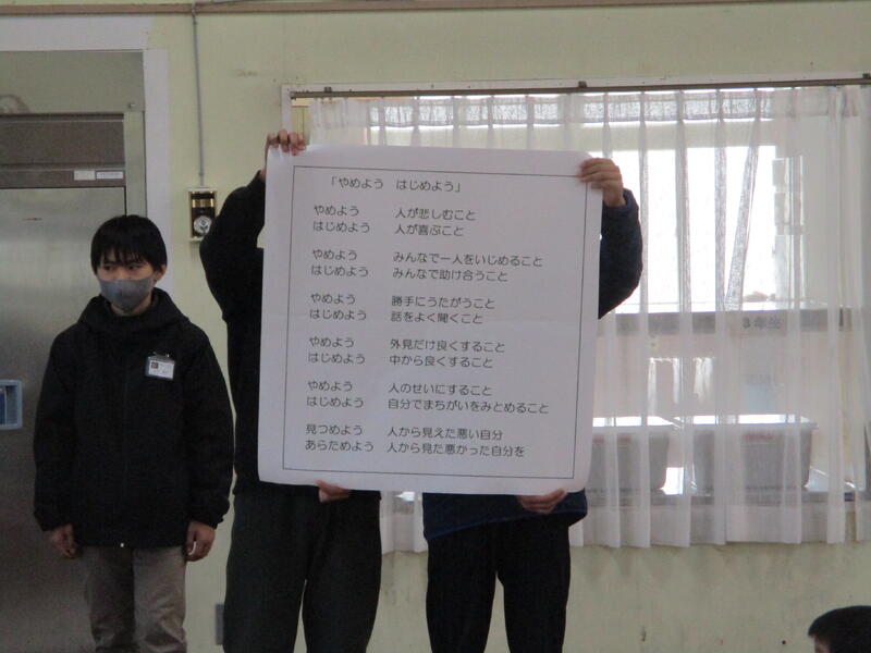 12月16日(金)に、2学期人権集会を行いました。前半は人権学習で学んだこと、考えたことなどを各学級ごとに発表しました。後半は、縦割り班に分かれてサイコロトークをしました。サイコロの目によって、「しょうらいのゆめ」「すきなたべもの」「じぶんのすきなところ」などを話しました。聞いている人は、「自分だったら・・・」と考えながら聞きました。人によって自分と似ていたり、違ったりする考えや思いがあることを、ゲームを通して感じる機会になりました。