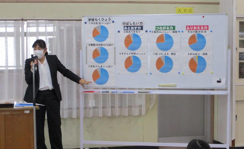 次に、校長から、学校教育目標の振り返りについて話がありました。1学期の須恵小学校の子供たちが、がんばっていたことやこれからがんばっていきたいことを、グラフを使って説明しました。そして、夏休みの生活で、「一番に命を大切にすること」を話しました。長い夏休みです。安全に気を付けて元気に過ごしてほしいと思います。