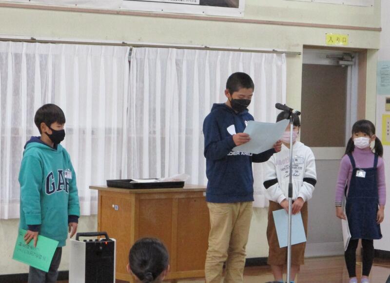 12月23日(金)の2学期最後の日は、雪が積もり、朝から雪遊びを楽しんだ子供たちでした。2時間目にランチルームで終業式を行いました。各学年代表による作文発表では、2学期に頑張ったことや冬休みにやってみたいことなどを堂々と発表できました。校長先生からは、2学期の学校目標に関する児童アンケートの結果や、命を大切にして冬休みを過ごしてほしいという話がありました。事故やケガ、病気に十分に気を付けて笑顔いっぱい、元気いっぱいの冬休みになることを願っています。