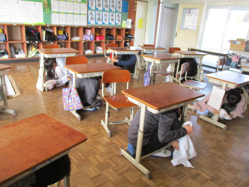 11月1日(火)にシェイクアウト訓練を行いました。災害発生時の緊急放送や担任の指示を落ち着いて聞き、初動対応に係る知識やとっさの行動を身に付けるとともに、自分の命を自分で守ろうという態度を身に付ける目的で訓練を行いました。それぞれの活動の場所で、①「低い姿勢」②「頭を守る」③「動かない」を意識して行動しました。
