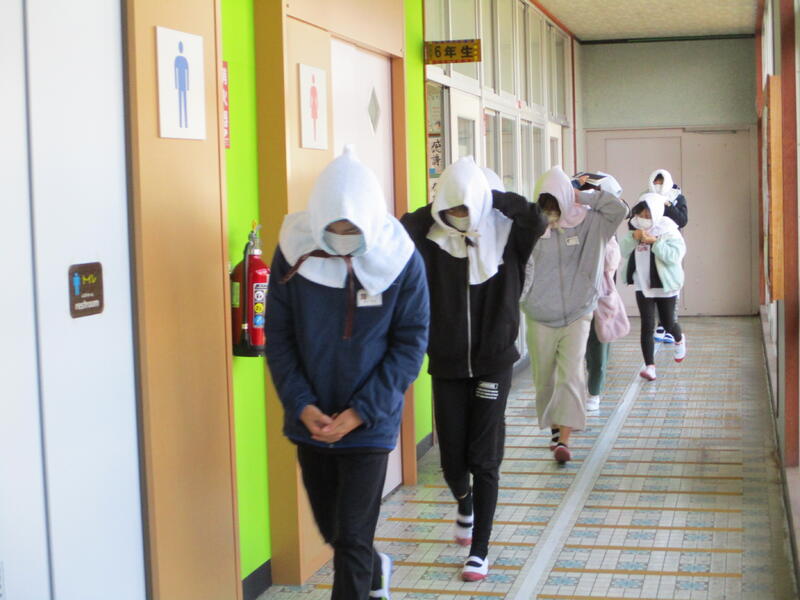 1月17日(火)地震時を想定した避難訓練を行いました。28年前の1月17日は、阪神・淡路大震災が発生し、たくさんの犠牲者と被害が出た日でもあります。これまでの避難訓練同様、「命を守る学習」として真剣な態度で訓練に臨みました。「お」さない・「か」けださない・「し」ゃべらない・「も」どらない の「命を守る合言葉」を意識して、手作りの防災頭巾などで頭を守りながら避難しました。訓練後は、各学級で「災害から命を守るために」の学習をして、学びを深めました。