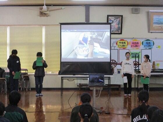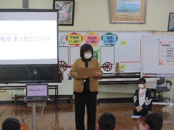 須恵小学校では、1月16日(月)~20日(金)を給食週間と定め、給食や食についていろいろなことに取り組みました。その中の一つとして、1月17日(火)朝の時間に、給食集会を行いました。給食委員会による「給食センターの方々の仕事」についての発表と、栄養教諭小山先生に来校いただき、「献立表に込められた思い」について話をしていただきました。