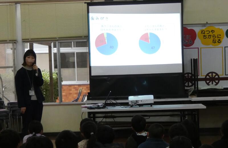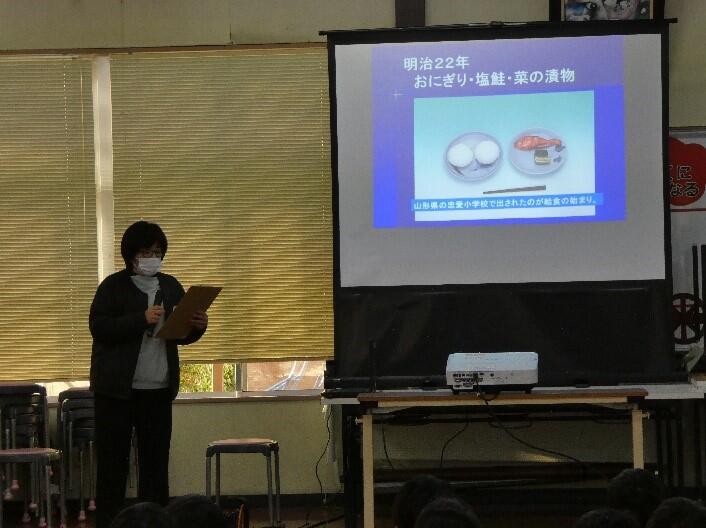 1月15日(月)から1月26日(金)まで、須恵小学校では給食旬間と定め、取組を行っています。その取組の中の一つ、「給食集会」を1月16日(火)の朝の活動の時間に行いました。給食委員会の子供たちが、全児童を対象に調査した「きらいな食べ物」についてのアンケートの結果や、「給食に携わる方々の思いと食べ物の栄養」について考えたことを発表しました。また、栄養教諭の小山先生に来ていただき、「給食の歴史」についてお話をしていただきました。全校児童で、給食について考える時間になりました。