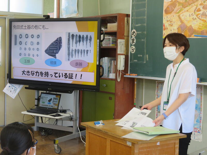 6月30日(木)、6年生社会の授業では、あさぎり町教育委員会学芸員の秋元めいさんに講師としてお話していただきました。歴史の学習をスタートした6年生にとって、縄文時代や弥生時代の大昔の人々のくらしの様子や、あさぎり町にも残っている古墳や土器についての話は、とても興味深かったようです。これから、日本の歴史を学びながら、身近なあさぎり町や須恵地区の歴史についても学びを深めていけたらと思います。