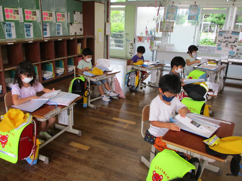 終業式後、担任から1学期の振り返りや夏休みのくらしについて話をしました。1年生は、初めての通知表を受け取りました。ページを大事そうにめくりながら、1学期の頑張りを確かめていました。