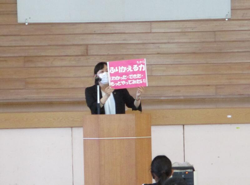 次に、校長から、学校教育目標の振り返りについて話がありました。1学期の須恵小学校の子供たちが、がんばっていたことやこれからがんばっていきたいことを、グラフを使って説明しました。そして、夏休みの生活で、「一番に命を大切にすること」を話しました。長い夏休みです。安全に気を付けて元気に過ごしてほしいと思います。
