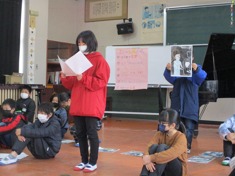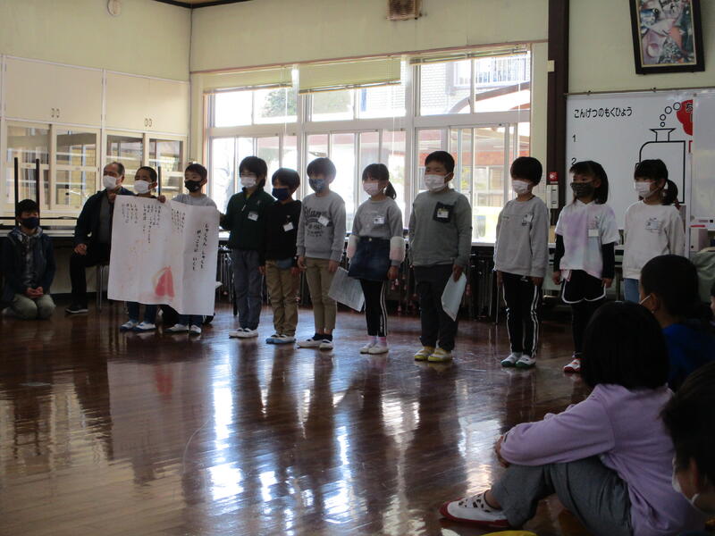 1年生「しゃくらんしゃくとがっこうにいくと」水俣病のため8才で亡くなったとよ子さんの話から、学校では、命と友達を大切にして仲良くすごしたいと発表しました。