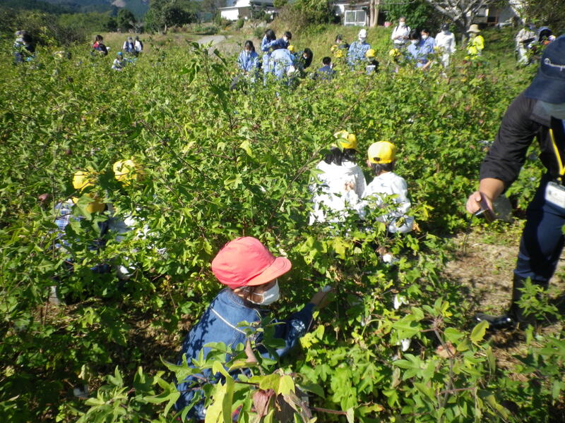 10月27日(水)の5,6校時に、和綿の里づくり会の一員として、和綿の収穫を行いました。白い和綿に触れた児童は、「気持ちいい。」「ふわふわだ。」と言葉にして、高校生から説明された手順で和綿を収穫しました。つつじヶ丘学園、マインド熊本、南稜高校、球磨工業高校、人吉高校、老人会、須恵保育園等、総勢160人が参加し、20分程度の作業で約21kg(種を含む)の和綿が収穫されました。今後1月まで収穫は続きます。