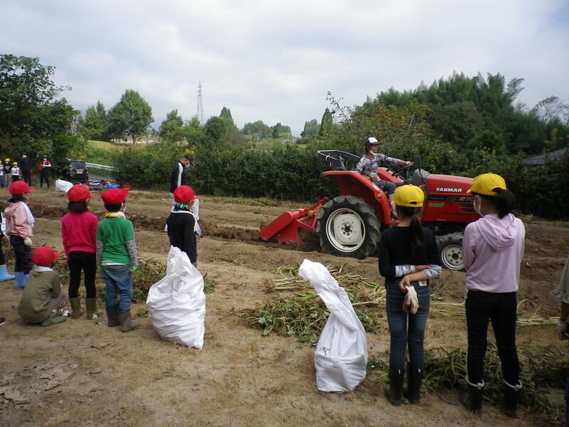 10月14日(木)に、JA青壮年部の方々のご協力のもと、芋ほりを実施しました。子供たちは、実際に掘ることで芋ほりの楽しさや大変さを実感していました。「土が硬いからみんなで協力しようね。」「いっぱい出てきた。」など、様々な声が聞こえてきました。その後、登場したトラクターが、どんどん芋を掘り出す様子を見て、「早いなぁ。」「あっと言う間だ。」など、機械の凄さを感じていました。みんなで協力し、たくさんの芋を掘ることができました。