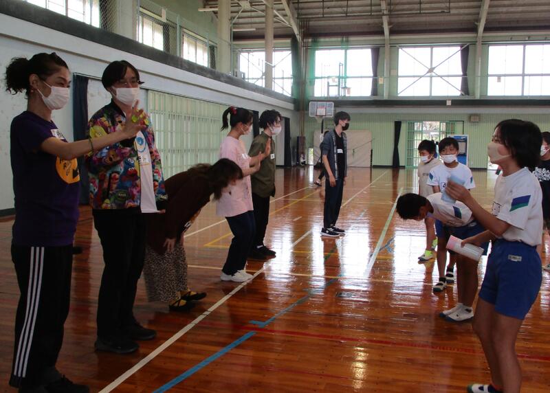 10月18日、熊本市の「劇団きらら」による、いきいき芸術体験教室が開催されました。7人の方に指導していただきました。イメージを膨らませて、役になりきって話したり、体の動きをつけて伝えたりと、表現の工夫をたくさん紹介されました。「恥ずかしかったけれど、やってみると楽しかった。」という児童の感想が多くありました。特に高学年の児童には、池田さんの「想像力は生きる武器になる。」という言葉が胸に響いたようです。今はないもの、見えないものを想像することは、思考力や発想力、思いやりの気持ちも育むことにつながることでしょう。この気持ちを大切にし、今後も表現することを楽しむ心豊かな児童の育成を目指していきたいと思います。