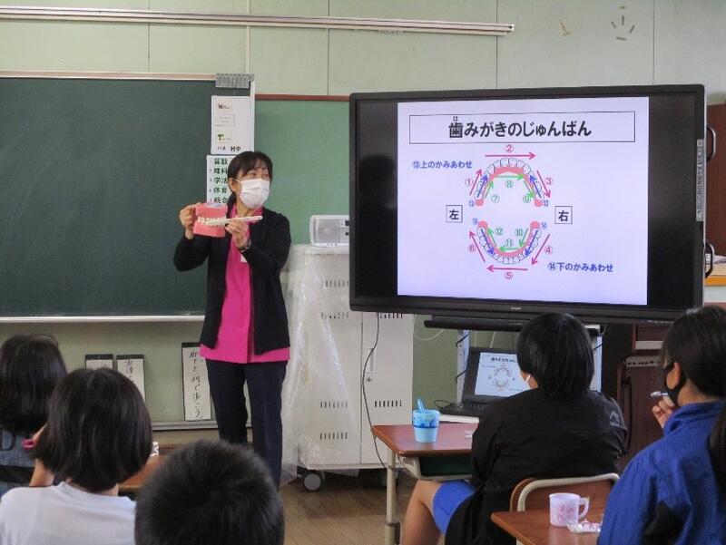 11月10日(水)、12日(金)、15日(月)の2,3校時に、歯科衛生士の柳本喜恵子様にご来校いただき、歯科教室を行いました。むし歯のできる仕組みやおやつの取り方、正しいフロスの使い方など、分かりやすくお話しいただきました。今年度は、コロナウイルス感染症予防のため、例年実施している歯の染め出しやブラッシング指導はできませんでしたが、マスクの上から歯ブラシを動かす「エアー歯みがき」で正しい歯のみがき方を学びました。これからも、むし歯ゼロを目指して、丁寧な歯みがきやおやつの取り方の工夫など、心がけていきたいです。