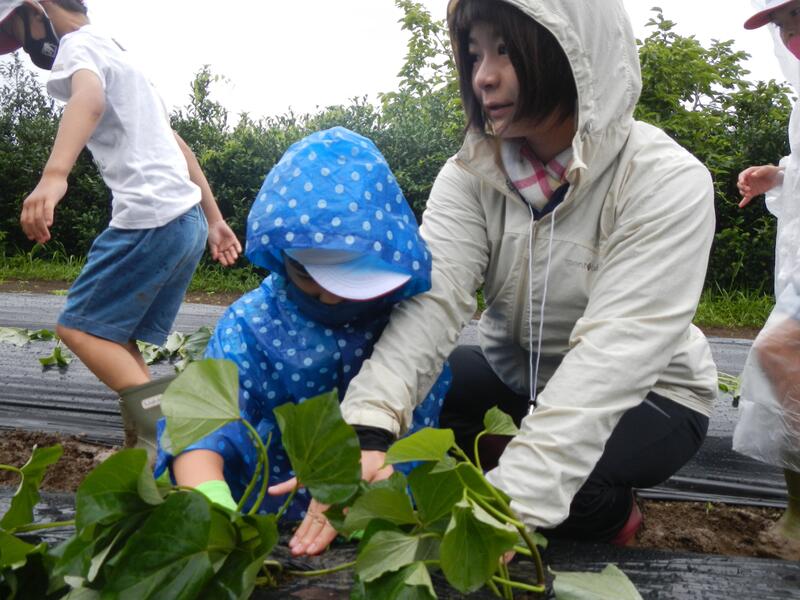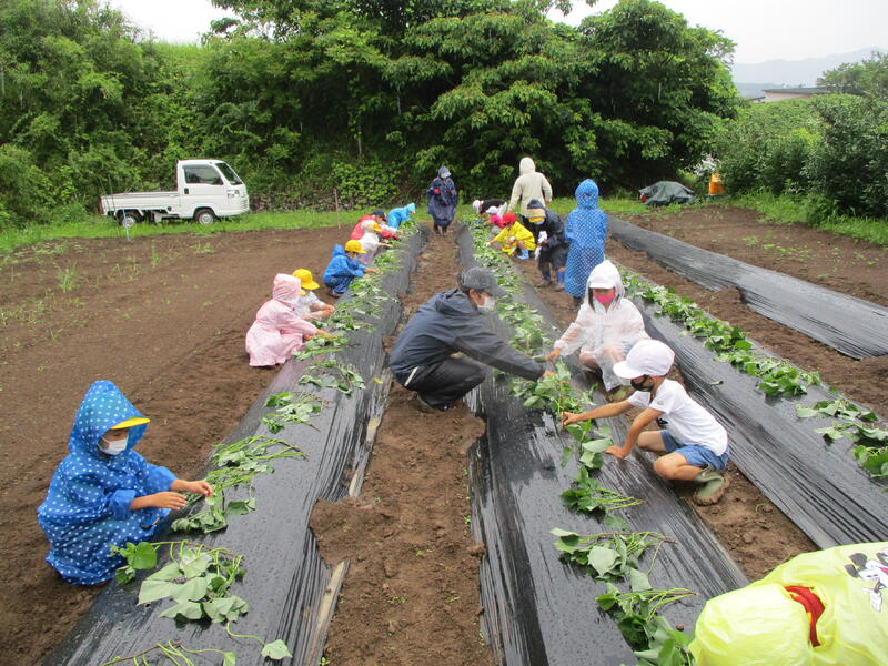 子どもたちは毎年この行事をとても楽しみにしています。小雨ではありましたが、つるさしを終えた子どもたちの日記から、「雨がふっていたけど、つるがすぐ水を飲めたからよかったです。」や「これからは、草むしりや水やりをがんばりたいです。」など充実した時間だったことが伝わってきました。『大きくなあれ、おいしくなあれ(^^♪)』