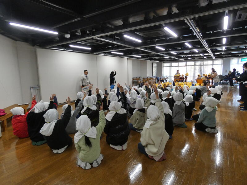 1月16日(火)に、地震時の避難訓練を行いました。今年度は、須恵保育園との合同訓練を実施しました。避難の放送を聞いた後、防災頭巾で頭を守りながら避難しました。