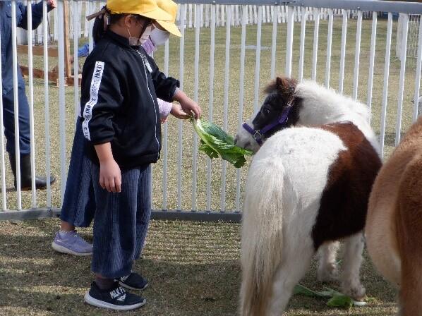 普段は触れ合う機会の少ないポニーやヤギなどについて、高校生から説明やクイズをしてもらったり、それぞれの動物と触れ合ったりしました。ウサギとの触れ合いの時間には、聴診器で心臓の音を聞かせてもらい、「ぼくの音よりはやい」と、心音の違いについて話をしていました。