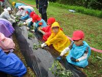 1・2・3年生が実施した芋の苗植えは、保育園と合同でした。カッパに身を包み、苗を植えている姿が、印象的でした。