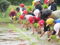 6月17日(月)の午後から田植え・芋の苗植えをしました。当日は雨が降ったりやんだりする中ではありましたが、JA青壮年部の方々のご協力の下、無事実施することができました。