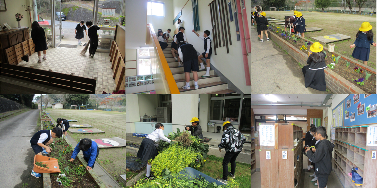 3月24日(火)の1時間目は、大掃除でした。教室の掃除が終わった後は、廊下、階段、玄関、靴箱、あらゆるところを探して掃除をしていました。最後には、学級園の草取りなど時間いっぱい頑張っていました。おかげで、とってもきれいになり、来年度を気持ちよく迎えられそうです。