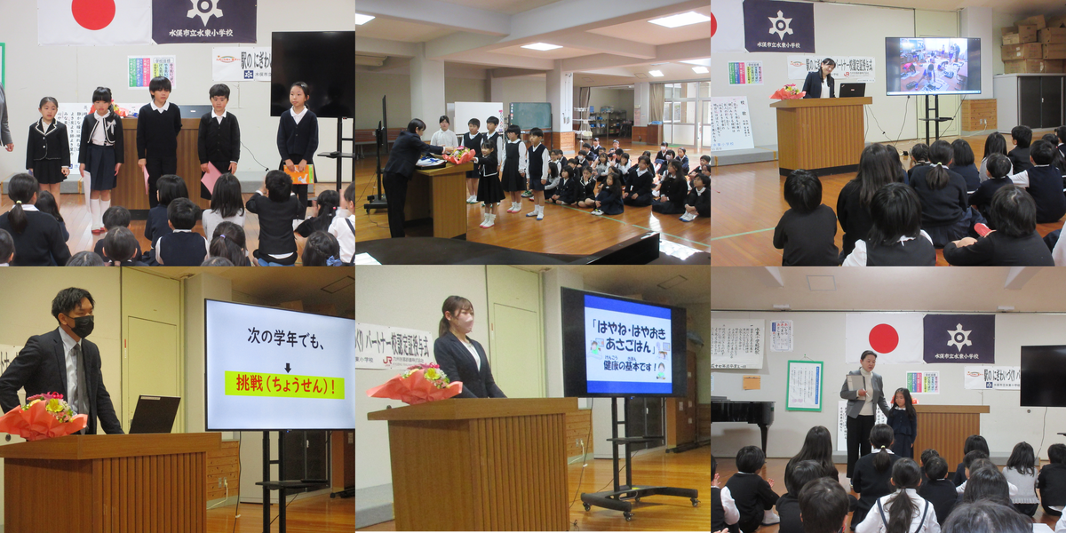 3月24日(火)の2時間目は修了式でした。各学年の代表児童から「一年間を振り返って」の作文発表や修了証授与がありました。その後は、「思い出のアルバム~3学期バージョン~」のDVDを見て、みんなで盛り上がりました。校長からは、「春休みは新年度の準備期間なので、自分をレベルアップするための行動をしてほしい」と話しました。生徒指導担当、保健担当からも、冬休みに頑張ってほしいことや気を付けてほしいことなどの話がありました。最後に、残念ながら転出する児童の紹介がありました。とても寂しいですが、次の学校でも頑張ってほしいと思います。