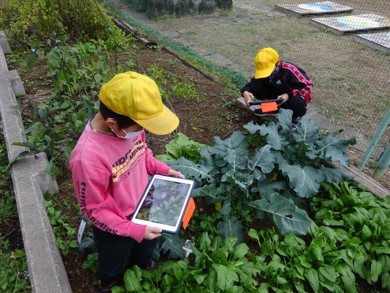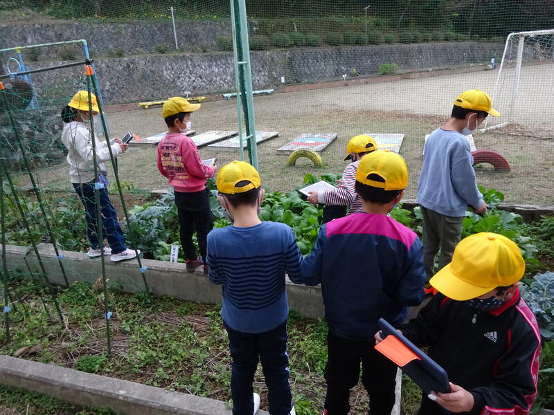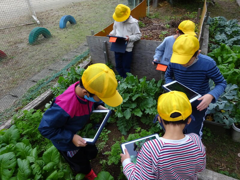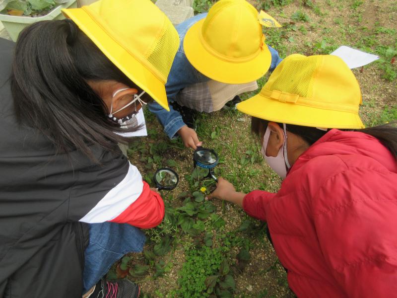 校庭をめぐり、「ナナホシテントウがいたよ!」や「これ、オオイヌノフグリじゃない?」と、声を掛け合いながら、真剣に楽しく観察することができました。