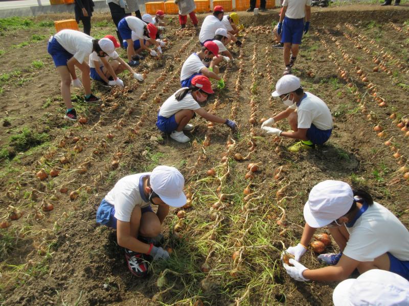 1時間目に3~6年生、2時間目に1、2年生が体験しました。子ども達は、楽しそうに収穫したり、収穫したてのサラダ玉ねぎの香りを感じとったりして収穫できたことを喜んでいました。