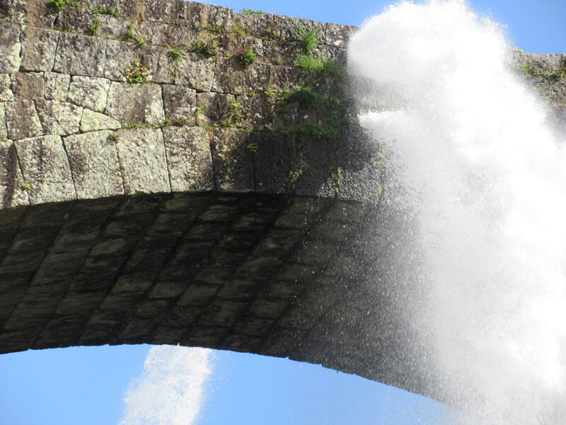 お弁当を食べ終え、放水を見るために通潤橋ところに行きました。通潤橋を間近で見た子どもたちは、「大きいなー!」「水が出るなんてすごい!」「早く見たいなー!」と感動しているようでした。そして放水が始まり、高い位置から水が落ちてくると、「おおー!」と大きな歓声が上がりました。どっと落ちる水の勢いに驚き、水しぶきを浴びながら写真をたくさん撮っていました。ボランティアの方に案内してもらいながら、学びを深めることができました。
