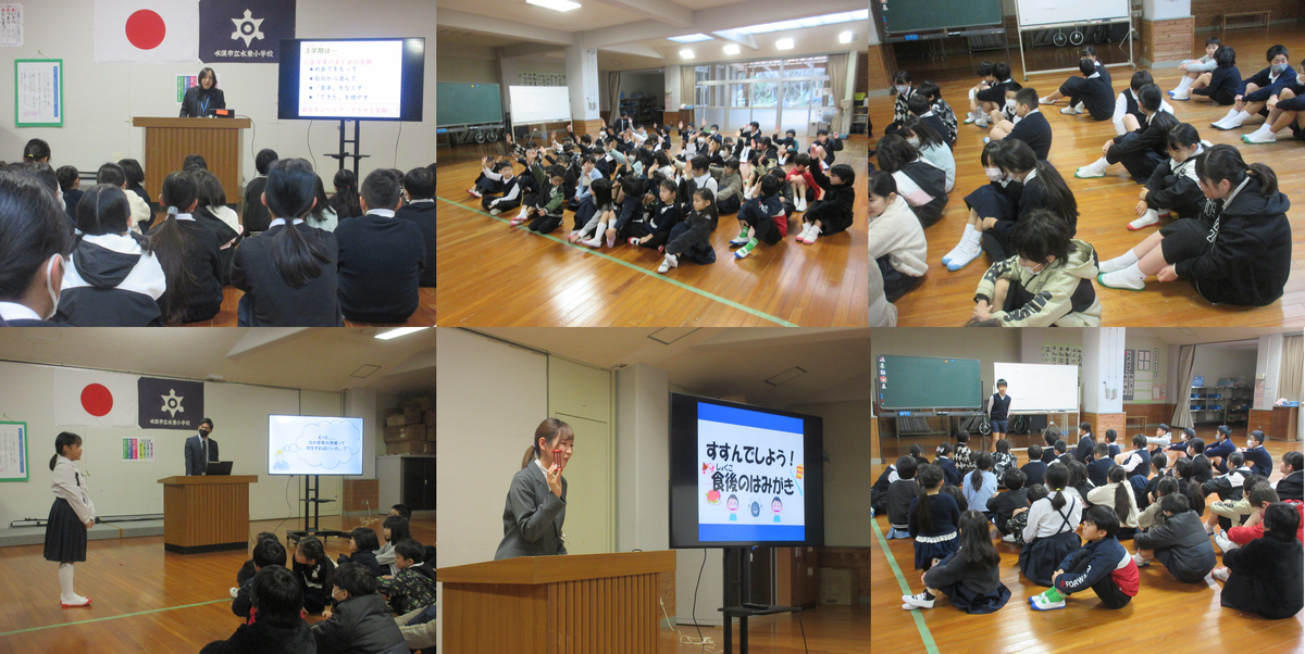 1月8日(木)1時間目は3学期の始業式でした。久しぶりに会った子供達はとっても元気そうでした。校長からは、2学期の終業式でお願いしたことの振り返りと3学期に頑張ってほしいことなどを話しました。挙手してもらった結果は、家でのお手伝い◎、ゲームのしすぎ・動画の見すぎ△、命を大切にすること◎でした。3学期は、各学年のまとめの学期、次の学年への準備の学期なので、様々な行事の中で、また日常生活の中で、自分をレベルアップしてほしいと思います。生徒指導の先生や保健の先生からも、3学期に頑張ってほしいことやお願いなどがありました。