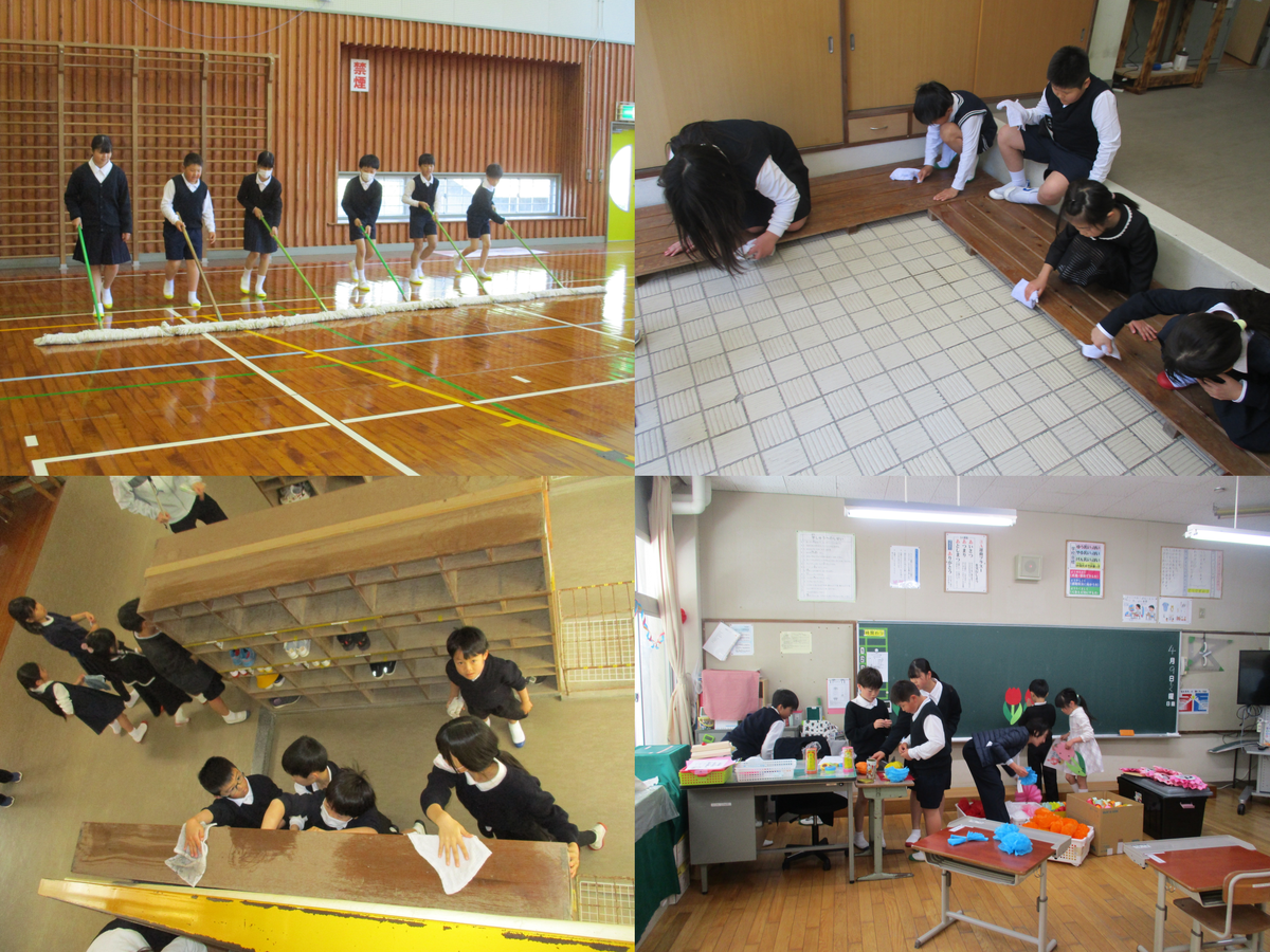 3月24日(火)の1時間目は、大掃除でした。教室の掃除が終わった後は、廊下、階段、玄関、靴箱、あらゆるところを探して掃除をしていました。最後には、学級園の草取りなど時間いっぱい頑張っていました。おかげで、とってもきれいになり、来年度を気持ちよく迎えられそうです。