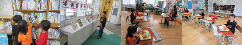 4月10日(金)の1時間目に、初めての図書室での本借りをしました。「たくさんある!」「読んだことない本がある!」ととても楽しそうでした。また、4時間目が終わると初めての給食でした。エプロンを着て帽子をかぶって、ばっちり準備ができました。今日の給食は太刀魚のフライやミルクパンなどなかなかボリュームがありましたが、美味しそうに食べていました。