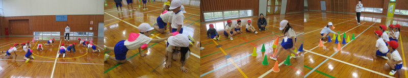 4月15日(水)の2時間目に、1・2・3年生は体育で「1年生といっしょにあそぼう」のめあてのもと、楽しく活動していました。「かめさんずもう」では、背中に乗ったコーンを落とさないように友達のコーンを落とすというゲームをしていました。最後の二人が残るとみんなで声援を送っていました。「リレーパズル」では、4種類の色のばらばらになったコーンをそろえていくリレーでとっても盛り上がっていました。きっと、1年生も喜んでくれたことと思います。