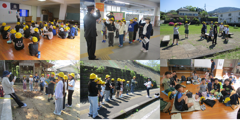 4月16日(木)の歓迎遠足では、本年度から新しく企画した校区スタンプラリーに出かけました。縦割り班ごとに4つの場所(新水俣駅、東公園、団地公園、初野神社)で、ミッションをクリアーするという新しい遠足の形です。新水俣駅では、駅長さんがミッションを用意して待っていてくださっていました。協力してミッションをクリアーし、全部の班が無事学校に戻ってくることができました。お弁当も美味しそうに食べていました。お忙しい中、準備していただきありがとうございました。天気もよくて良かったです!