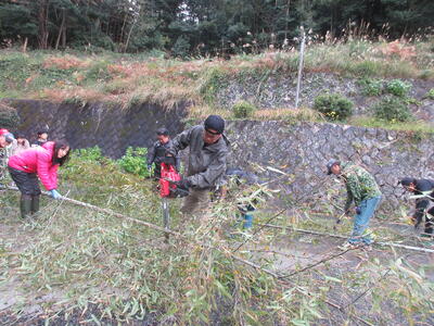 やぐらを組むための、竹の切り出し作業や、当日の点火に使用する竹の棒づくりでは、安全に配慮しながら、役割分担を