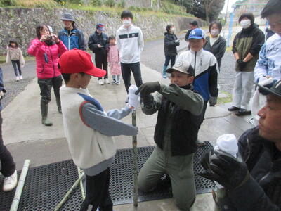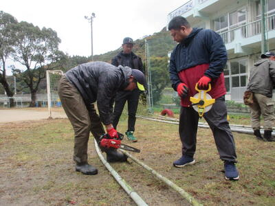 水東小学校の門松を作る5・6年生の学年行事が12月17日に行われました。