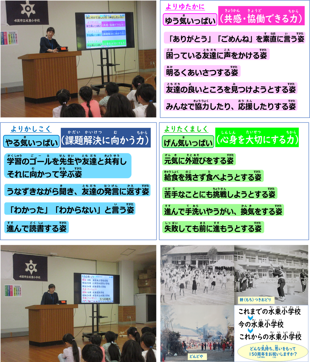 「学び」は現在も将来も役に立つことや水東小は「発信力」「対話力」が課題であること、また、「学び合い」をパワーアップするための5つのめあてを紹介しました。子供たちの感想には、「自分の考えと比べて、しっかり反応を返していきたい」「発信力と対話力をもっと高めたい」などがありました。水東っ子がさらに学びをパワーアップするのが楽しみです。