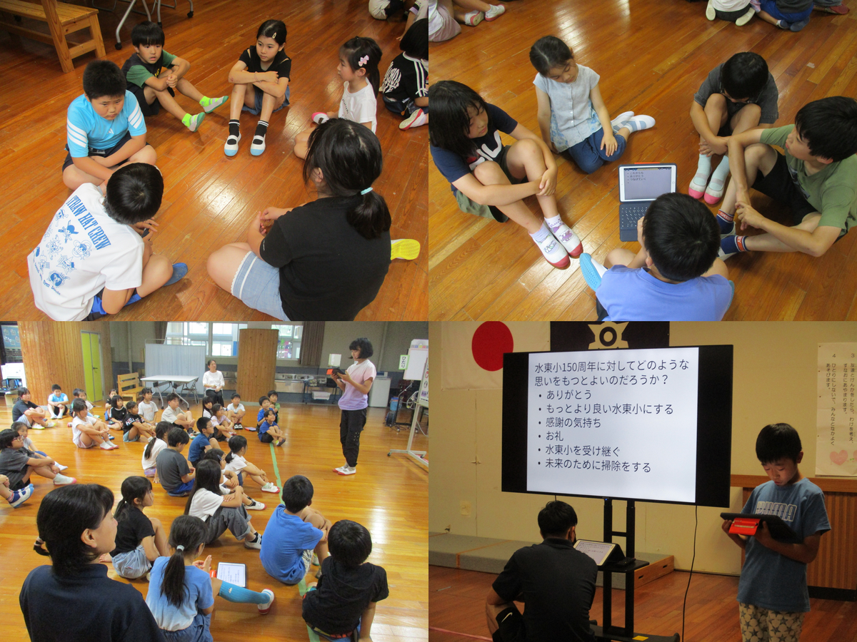 6月11日(水)の水東タイムで、創立150周年をお祝いするためのスローガン決めをしました。「これまでの水東小学校」「今の水東小学校」「これからの水東小学校」をイメージして、縦割り班で、スローガンに入れたいキーワードを出しました。難しいテーマでしたが、「受け継ぐ」「未来につなげる」「羽ばたけ」「感謝」などの素敵なキーワードができました。どんなスローガンになるのか楽しみです。