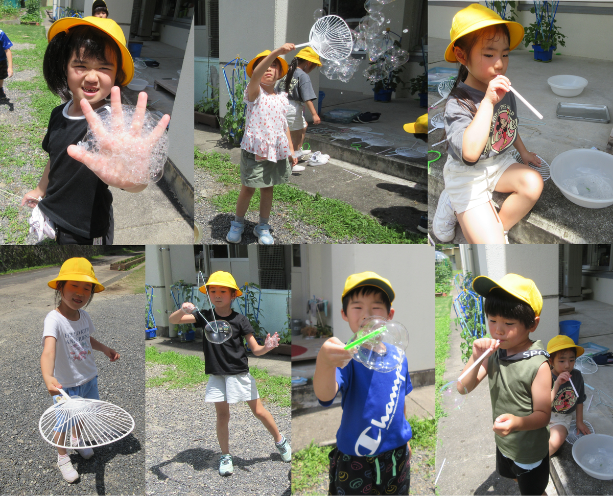 6月18日(水)の3時間目に、生活科の「なつとともだち」という単元で、水を使ってどんな遊びができるかを考えました。うちわやハンガーを使って楽しそうにシャボン玉遊びをしていました。