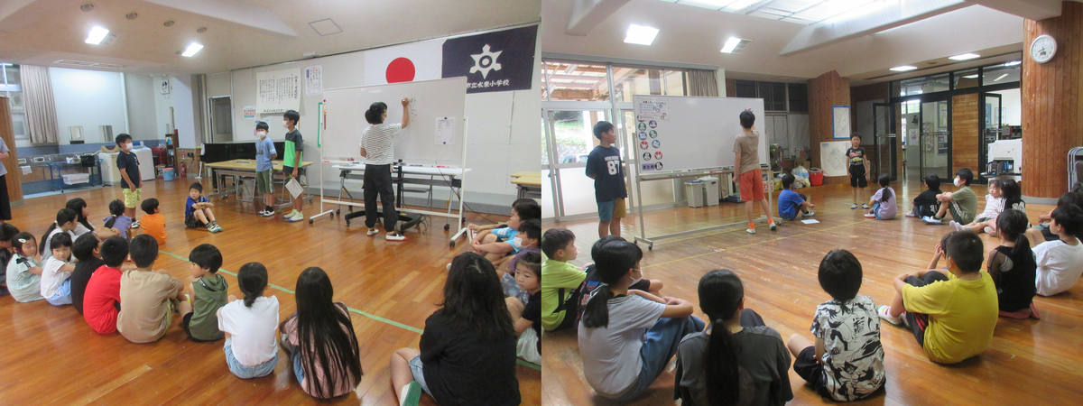 7月14日の朝活動の時間に、6年生から手作り紙芝居の読み聞かせを、1年生から劇のプレゼントがありました。6年生図工の「絵のお話でプレゼント」という題材で、ペアになってお話を作って紙芝居にしました。題名は「うさの最悪の一日」「たかなおにぎりの冒険」「まぐ太とサータンの大冒険」で、起承転結のあるとても面白い紙芝居に仕上がっていました。お返しに、1年生は、国語で学習した「大きなかぶ」の劇を披露しました。6年生も1年生も笑顔いっぱいでした。