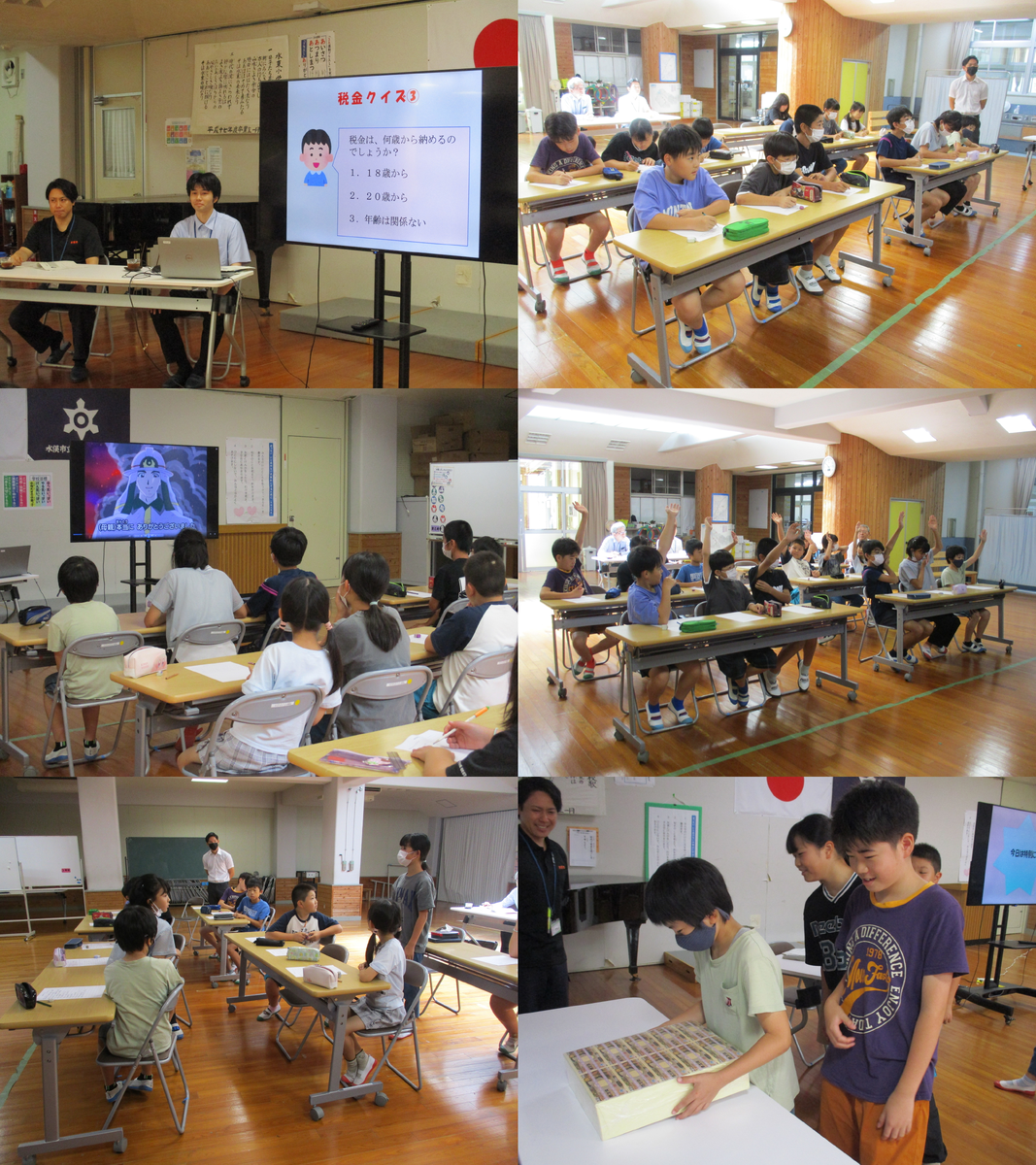 6月19日(木)に租税教室が行われ、5・6年生の子供たちが税について学びました。税についてのクイズやビデオ視聴、担当の方からの説明などがありました。身近な税金の使われ方を地元の写真などを使って説明していただきました。最後に、1億円はどのぐらいなのかを実際に見本のお札を準備していただき、手に持って実感していました。